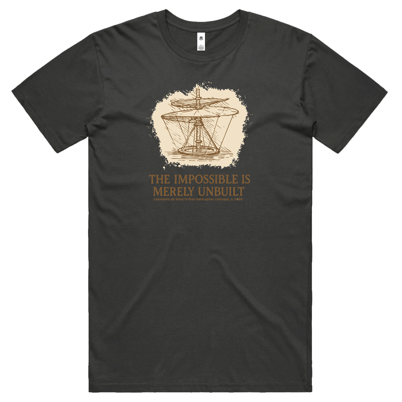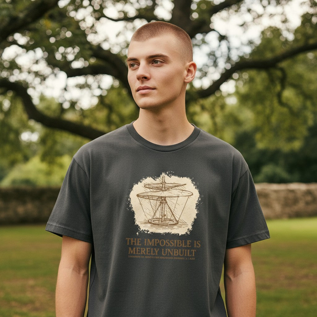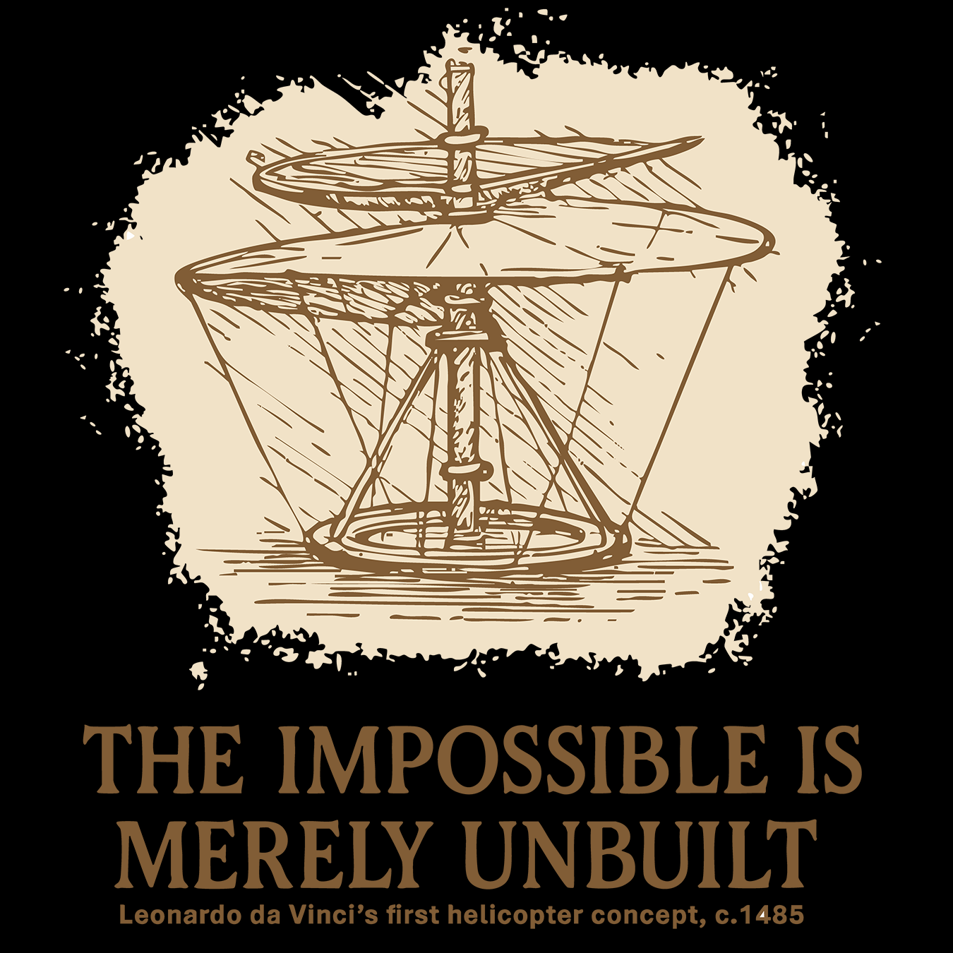 Inspired by Leonardo da Vinci’s visionary helicopter sketch from 1485, this design pays tribute to the original dream of vertical flight. The quote, “The impossible is merely unbuilt,” reminds us that innovation begins with imagination — and that every rotorcraft today started as a wild idea centuries ago.