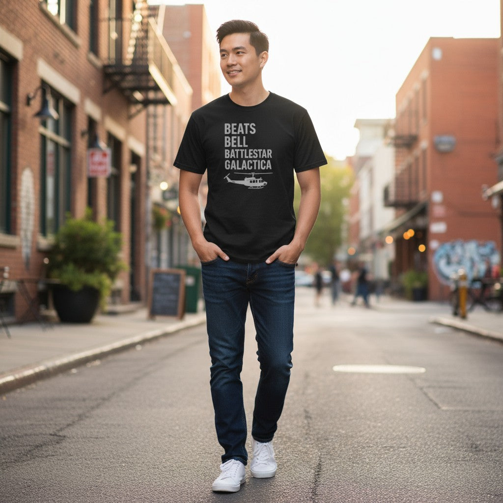 A nod to one of TV’s most legendary lines — reimagined for rotorheads. The Beats. Bell. Battlestar. tee celebrates the unmistakable thump of a Bell helicopter with a wink to The Office’s Dwight Schrute classic. Bold, minimalist, and instantly recognizable to both aviators and fans of pop culture perfection.