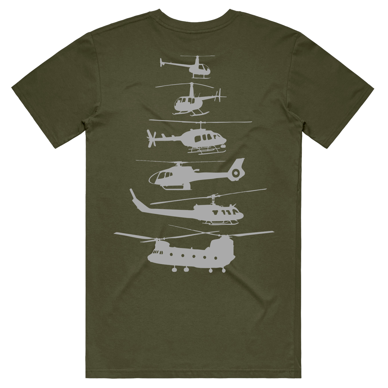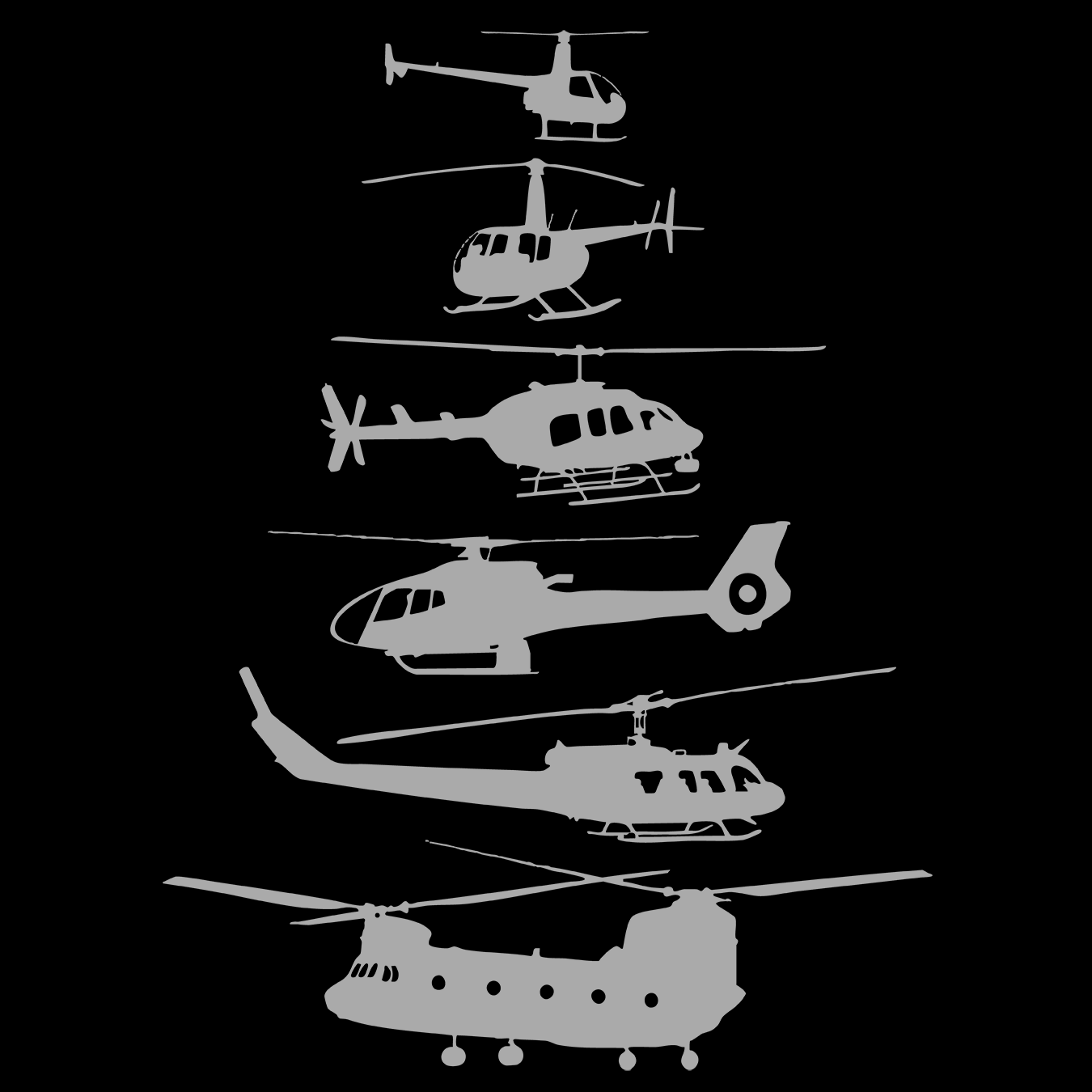 From light trainers to heavy lifters, the Evolution tee captures the unmistakable progression of rotary-wing design. A clean silhouette lineup celebrates the machines that shaped the skies — from the nimble R22 to the mighty Chinook.