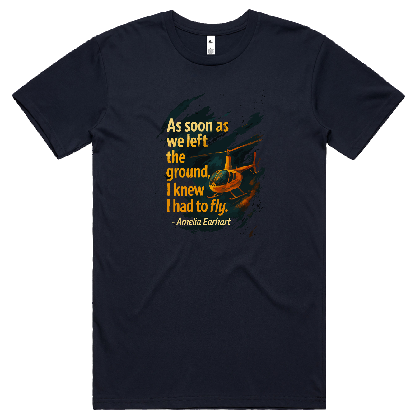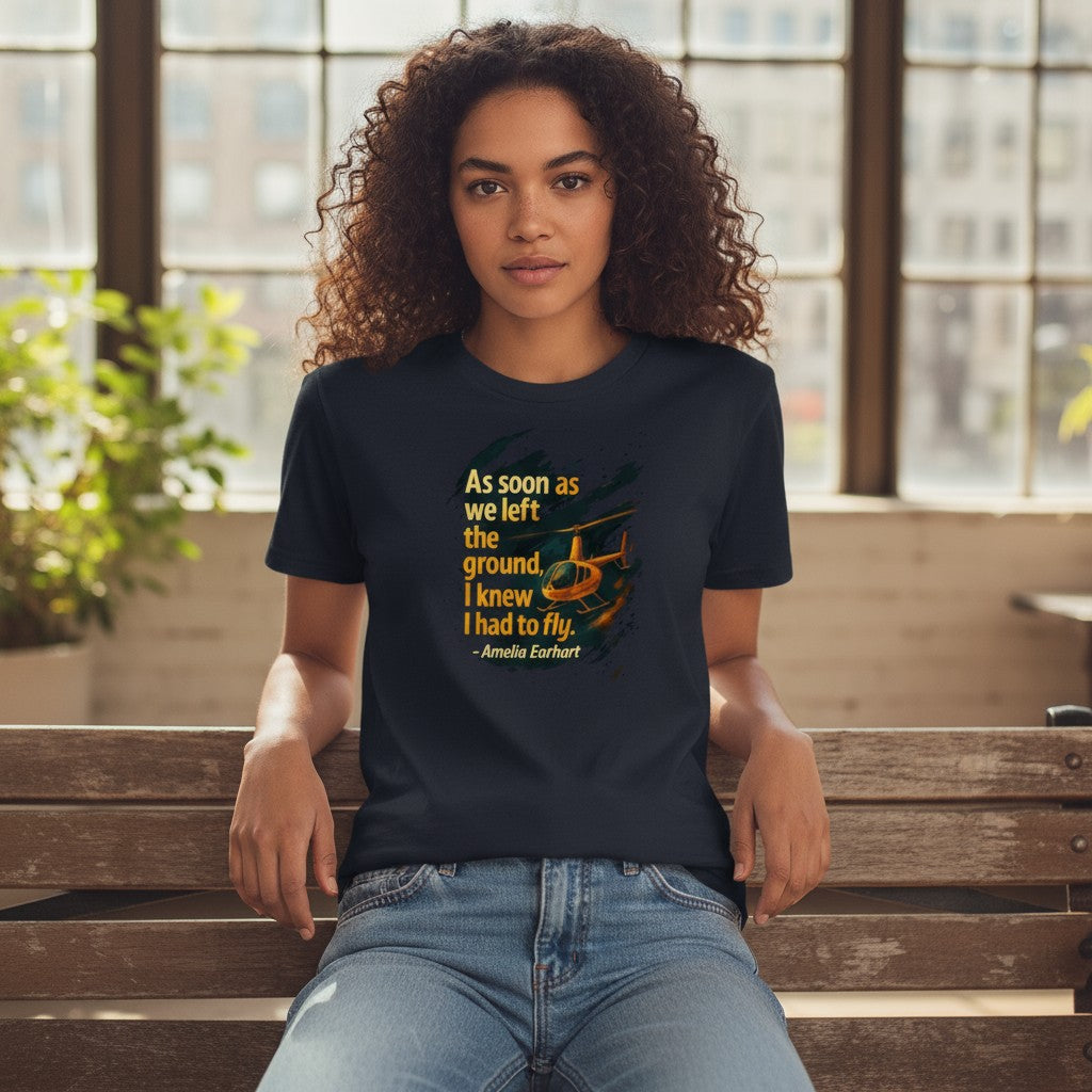 Celebrate the moment flight became more than just a dream. This artistic design features Amelia Earhart’s iconic quote — “As soon as we left the ground, I knew I had to fly.” — brought to life with expressive brush strokes and a helicopter silhouette soaring through a painterly sky.